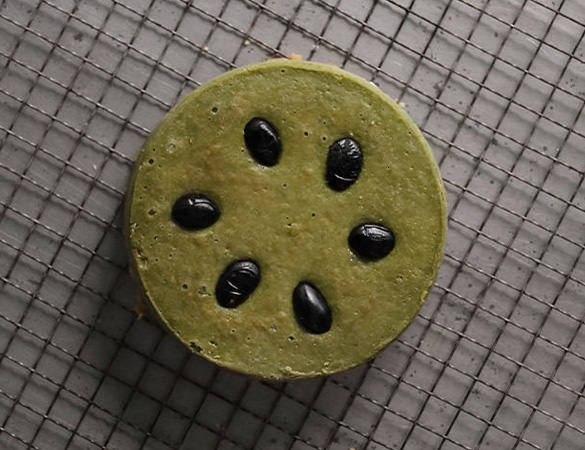 濃い緑色の色鮮やかでなめらかな生地に仕上げ、宇治抹茶と相性の良い和の素材、丹波産の黒豆を食感を残すように荒くキザミ、生地の中にまんべんなくたっぷり散りばめました。